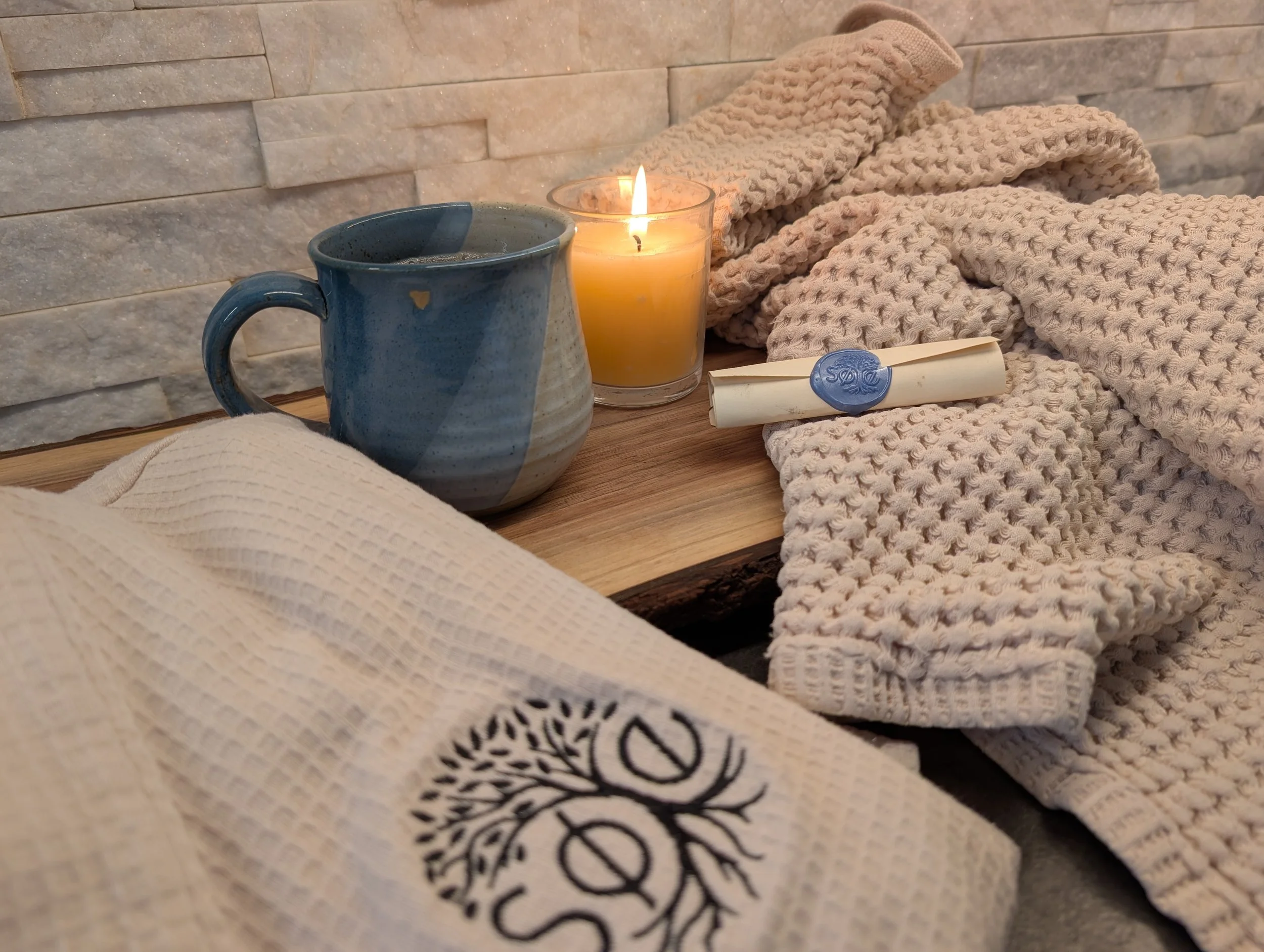 • Søle robe, towel, tea cup, candle, and Trollkveld scroll